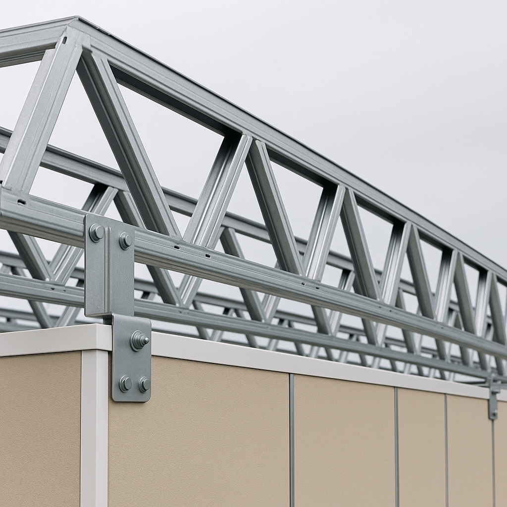 The Luxwood™ Truss System is engineered for rapid assembly and reduced on-site labor by eliminating most welding and replacing it with a bolt-on connection method. Fabricated from precision-cut light-gauge steel, the trusses are pre-designed to align with Luxwood wall panel dimensions and ceiling battens, allowing for clean integration and a predictable roofline. Each truss is secured using factory-punched mounting plates and standardized bolt patterns, speeding up installation while ensuring structural integrity. This system is ideal for both single- and multi-module buildings, supporting flat or pitched roof configurations with consistent performance and minimal onsite fabrication.
